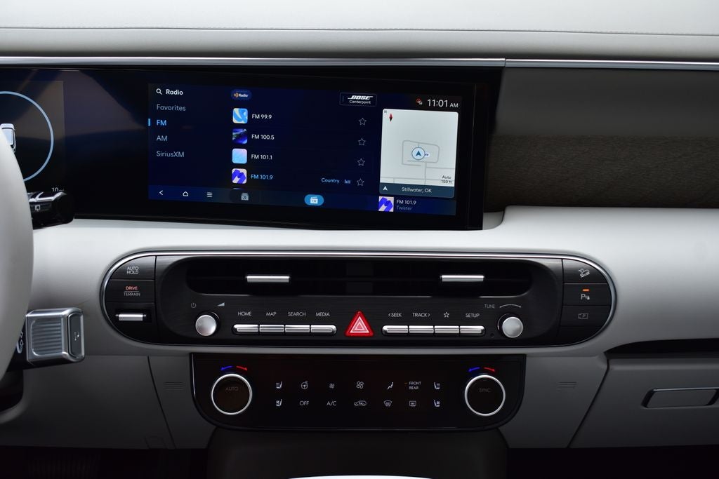 - Radio: Infotainment Navigation System -inc: Bose 14-speaker premium audio system w/Centerpoint and SoundTrue enhanced technology, 12.3" color touchscreen, wireless Apple CarPlay and Android Auto, HD Radio, Sirius XM, Passenger Talk 2.0 in-car intercom system, dynamic voice recognition, rear seat quiet mode, Bluetooth® hands-free w/wireless audio streaming, multiple device connection (up to 2 devices), USB connectivity, Bluelink + connected car services, Wi-Fi hotspot, steering wheel audio controls and Over-the-Air (OTA) software updates