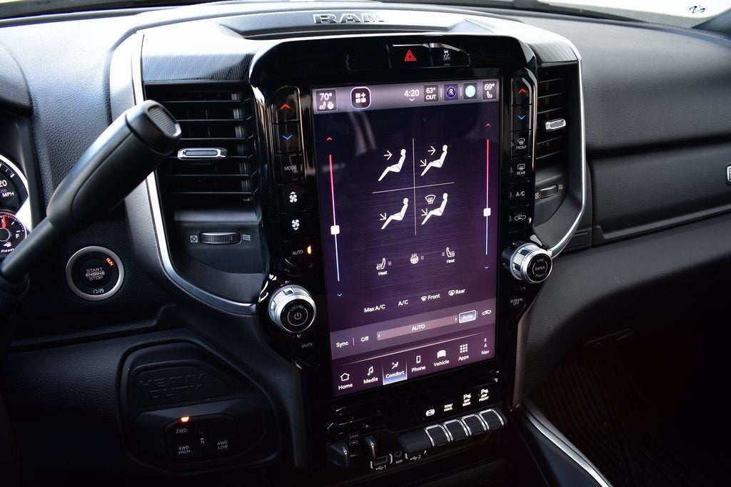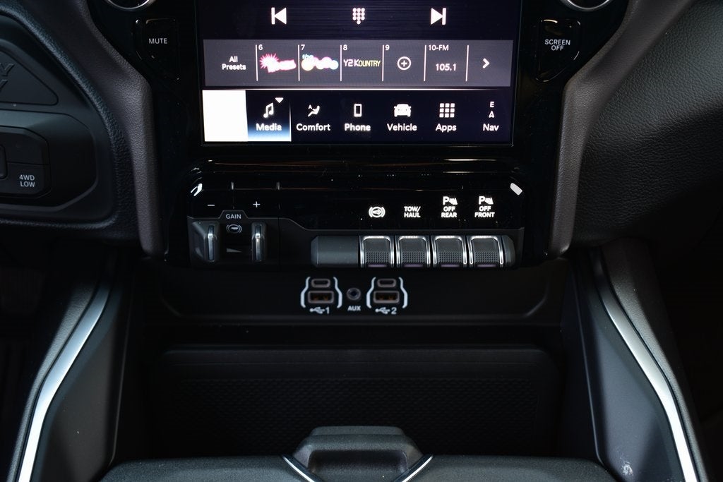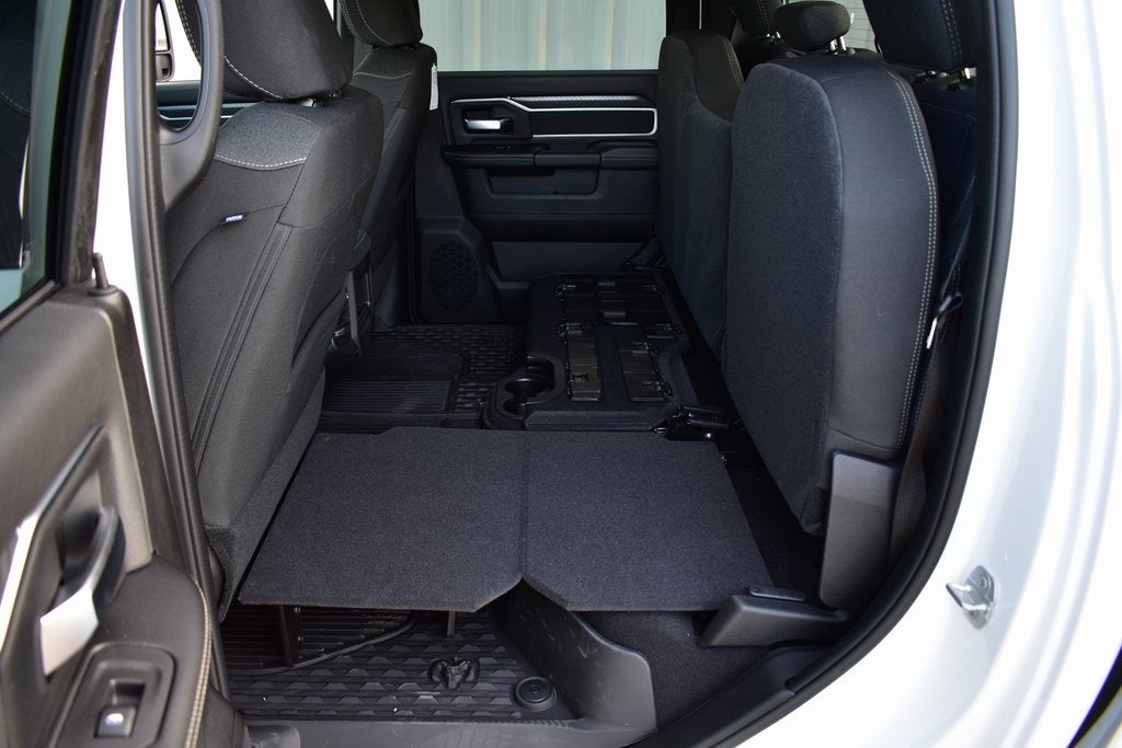 12 Touchscreen Display, 2 Way Rear Headrest Seat, 2nd Row in Floor Storage Bins, 3.42 Axle Ratio, 4 Way Front Headrests, 4G LTE Wi-Fi Hot Spot, 9 Alpine Speakers with Subwoofer, Air Conditioning ATC with Dual Zone Control, Alexa Built-in, Android Auto/Apple Car Play Navigation, Anti-Spin Differential Rear Axle, Apple CarPlay/Android Auto, Auto Power-Folding Mirrors, Auto-Dimming Rear-View Mirror, Big Horn Level 1 Plus Equipment Group, Black Exterior Mirrors, Black Exterior Truck Badging, Black Interior Accents, Black Wheel Center Hub, Body Color Grille-Surround, Bucket Seats, Connected Travel and Traffic Services, Connectivity - US/Canada, Disassociated Touchscreen Display, Dual Glove Boxes, Emergency Vehicle Alert System (EVAS), Exterior Mirrors Courtesy Lamps, Exterior Mirrors with Heating Element, Exterior Mirrors with Supplemental Signals, Foam Bottle Insert (door Trim Panel), Folding Flat Load Floor Storage, Footwell Courtesy Lamp, Forward and Reverse Utility Lights, Front fog lights, Front Seat Back Map Pockets, Full Length Upgraded Floor Console, Global Telematics Box Module, Gloss Black Nostrils/Mic Black Grille, Glove Box Lamp, GPS Antenna Input, HD Radio, Heated Front Seats, Heated Seats and Wheel Group, Heated Steering Wheel, Integrated Voice Command with Bluetooth®, LED Bed Lighting, Locking Lower Glove Box, Luxury Steering Wheel, Manual Adjust 4-Way Front Passenger Seat, Mirror Running Lights, MOPAR Deployable Bed Step, MOPAR Spray in Bedliner, Navigation System, Night Edition, Off-Road Info Pages, Painted Front Bumper, Painted Rear Bumper, ParkView Rear Back-Up Camera, Power 2-Way Driver Lumbar Adjust, Power Adjust 8-Way Driver Seat, Power Adjust Mirrors, Power Heated Folding Telescopic Mirrors, Power Telescoping Mirrors, Power-Adjustable Convex Aux Mirrors, Premium Cloth Bucket Seats, Quick Order Package 24Z Big Horn, Radio: Uconnect 5 Navigation with 12.0 Display, Rear 60/40 Folding Seat, Rear Dome with on/Off Switch Lamp, Rear window defroster, Remote Start System, Selectable Tire Fill Alert, SiriusXM Radio Service, SiriusXM with 360L, Steering Wheel Mounted Audio Controls, Trailer Tow Pages, Wheels: 20 x 8.0 Black Painted Aluminum.